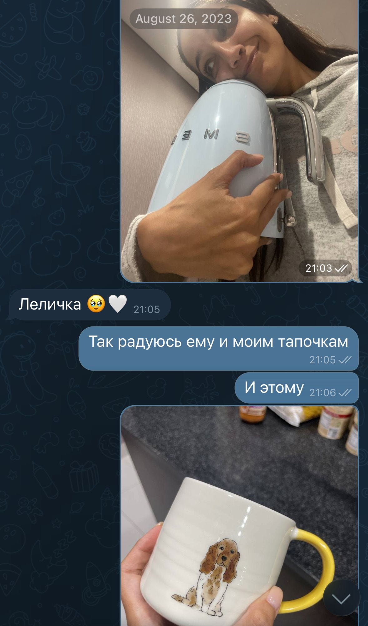 Это даже не ритуалы, а крошечные, почти незаметные моменты или вещи. Но именно они дают какое-то внутреннее спокойствие. Расскажу смешную историю. Когда я только переехала в Доху, почти месяц я жила, не разбирая до конца чемоданы, пока не въехала уже в свою квартиру, где могла полностью обосноваться. За это время, в виду всего стресса от переезда и моментального погружения в работу, я вообще забыла, что из вещей я взяла, что оставила в Баку. К моменту, когда я расставляла вещи по дому в Дохе, это уже ощущалось как-будто я открываю подарки)) Для меня самой, моя реакция на, внимание…ЧАШКУ, ЧАЙНИК и ТАПОЧКИ - была, мягко говоря, странной :D дело в том, что вытащив их из одного из чемоданов, я чуть не расплакалась. Я была уверена, что я оставила всё это в Баку, потому что ооочень много вещей я не взяла, думая, что это занимает лишнее место и я всё куплю уже здесь. В итоге, я почувствовала такую невероятную связь с домом, с элементами, которые создавали мне дома МОЙ уют и тепло, что найдя эти три абсолютно рандомные вещи на дне одного из чемоданов, я была просто крайне счастлива (и да, я обнимала чайник, когда его нашла :D). Звучит максимально тупо, но если ты когда-то оставлял свой дом и всю жизнь позади и начинал новую в чужом месте, наверное, только тогда ты действительно поймешь :)) Нашла тот самый момент в чатах, потому что помню, что сразу послала фото подруге, которая мне этот чайник и дарила))) Кстати, удивлена, что эта переписка нашлась, потому что почти всегда удаляю все чаты (еще один элемент OCD :D).